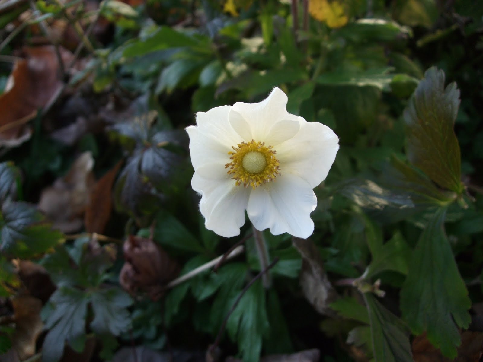 OK, so maybe my heralding of our first snowfall and next day melt was a little dramatic. I like the moisture the snow brings because till it freezes up, I can pull weeds with relative ease. What the first snow does is make me come to grips with the fact that summer is really over. Well it snowed early Friday, the paths were melted by Friday afternoon and it was all gone by Saturday afternoon. The sun came out Sunday and the temps were in the 50's. What better time to take some pictures? Not that I need an excuse to hunt around the yard for signs of life and beauty. The anemone pictured below must think its spring. It has 6 blooms on it. What a wonderful surprise