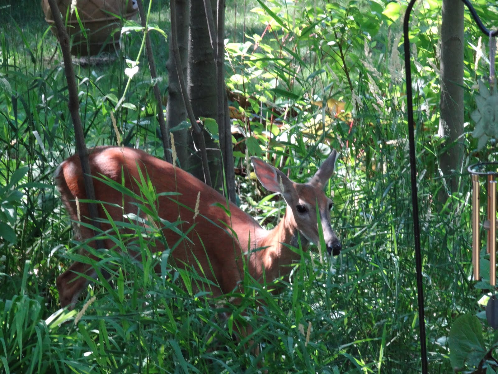 I put the wind chimes next to the bird feeders thinking that if the deer bumped into them, they would run off.
